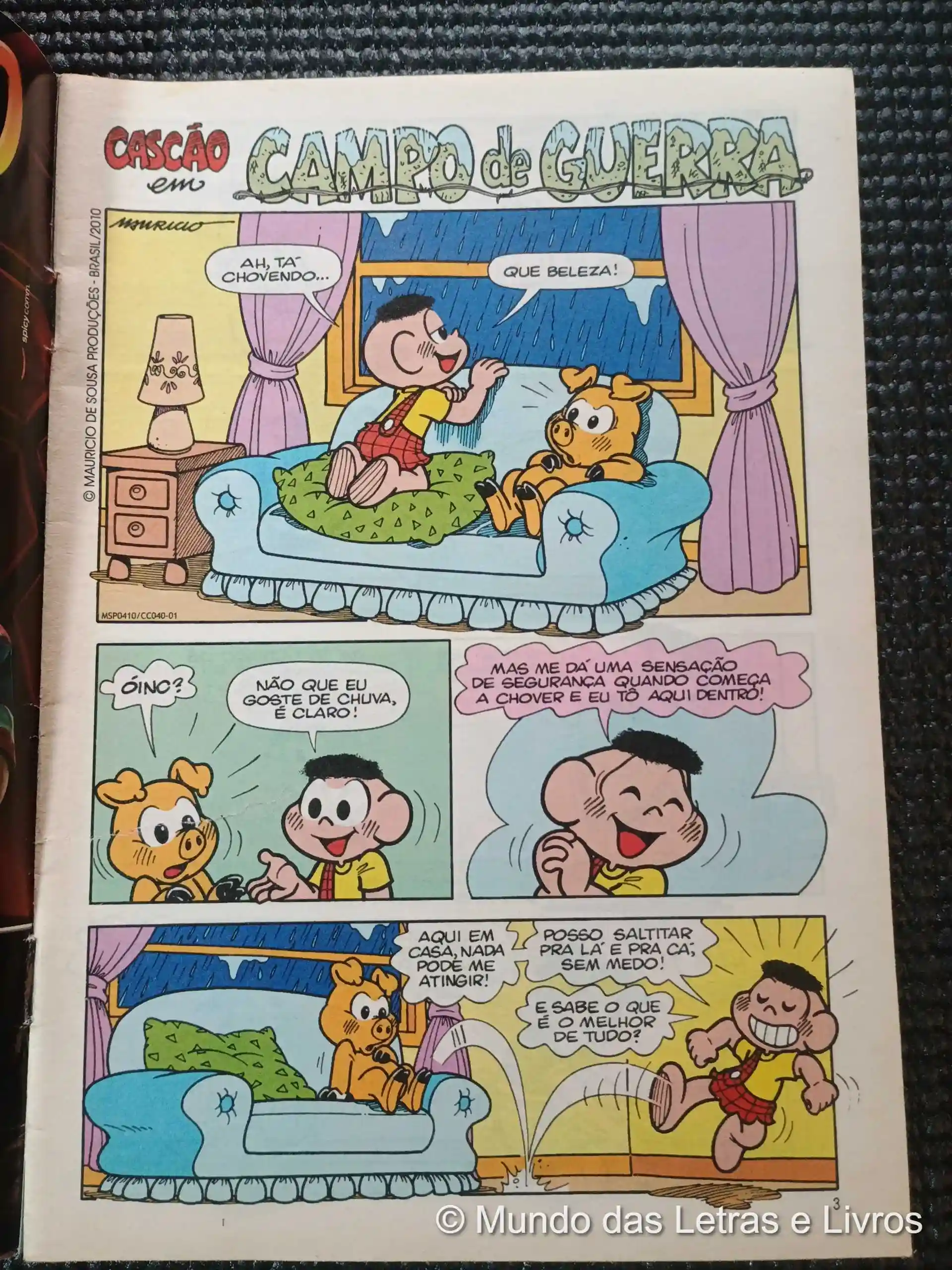 É mais um dia de chuva, e a casa do Cascão está cheia de goteiras. Ele terá que ajudar sua mãe a espalhar baldes pela casa, se imaginando em uma batalha num campo de guerra.