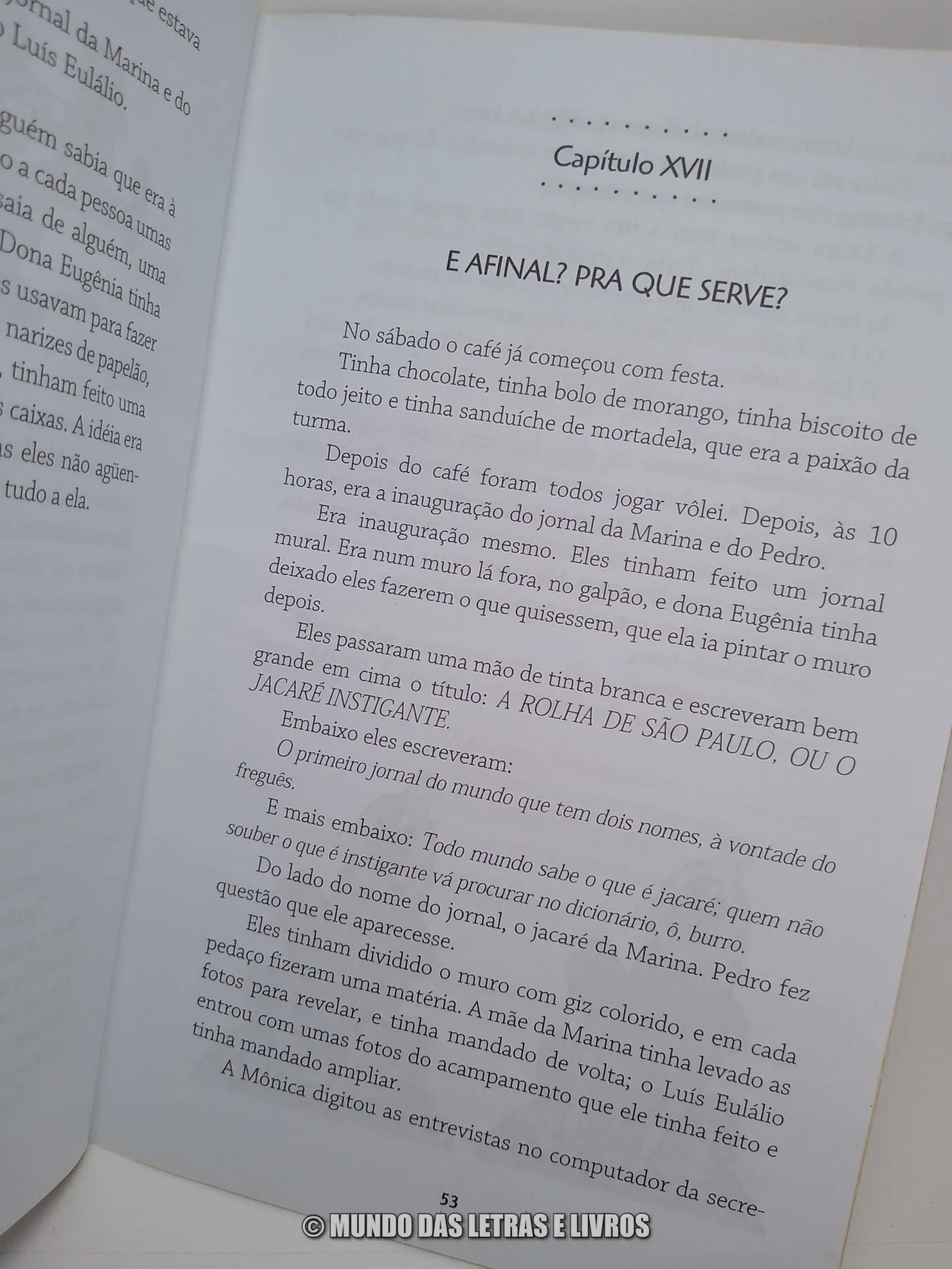 Acompanhe a jovem Marina em um acampamento de férias, onde uma simples gravura de jacaré se torna o ponto de partida para uma avalanche de perguntas. A indagação “Pra que serve?” desencadeia nela uma série de questionamentos sobre o propósito das coisas no mundo: para que serve ter filhos, ter irmãos, o dinheiro, estudar, comer ou viver? Determinada a encontrar respostas para essas indagações que tocam a própria existência, Marina embarca na curiosa missão de entrevistar as pessoas ao seu redor e registrar suas descobertas em um jornal. Ruth Rocha, com sua maestria narrativa, nos conduz pelas primeiras descobertas e reflexões da protagonista, sem jamais entregar as conclusões, estimulando o próprio leitor a refletir.
