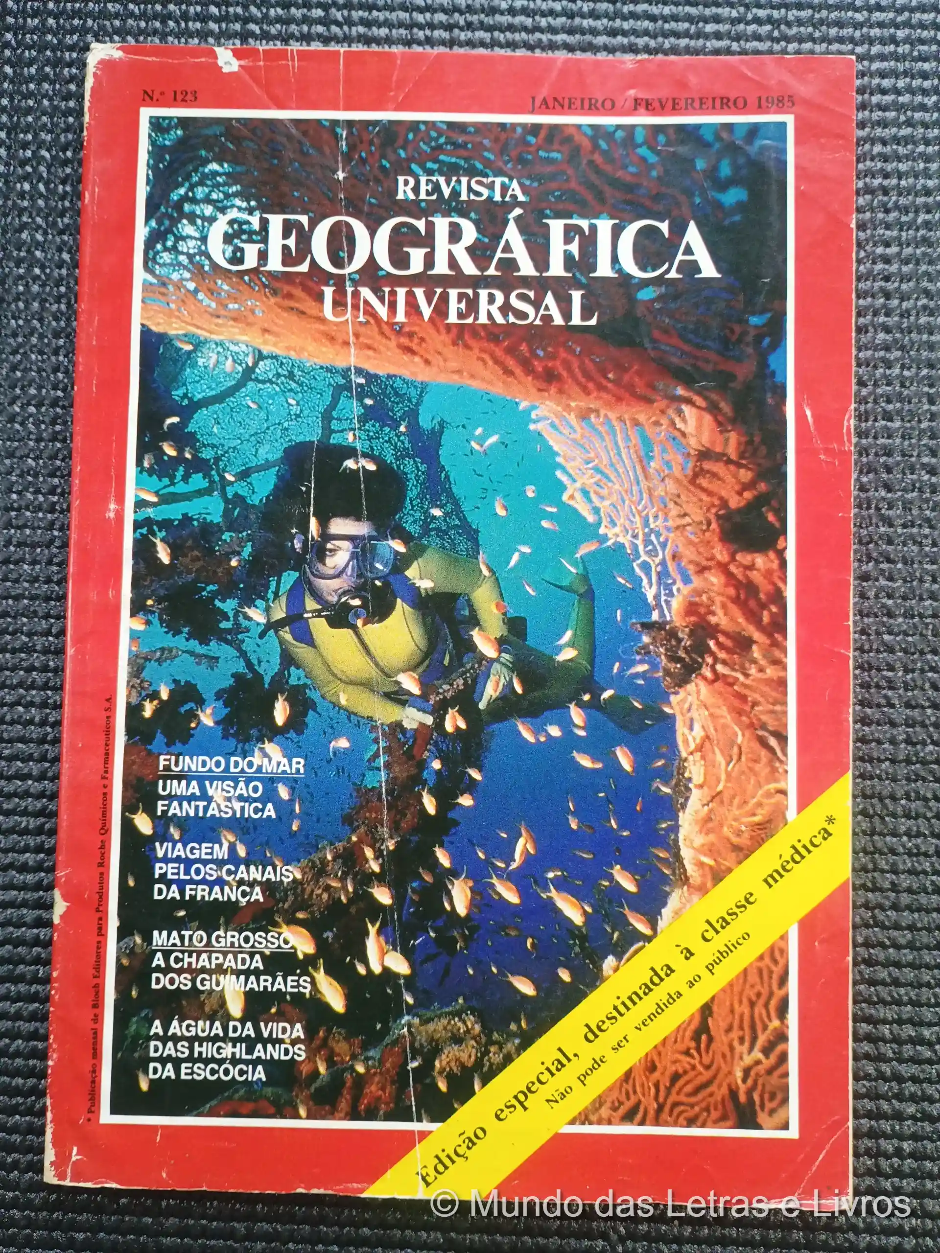 Revista Geográfica Universal Nº 123, publicada em Janeiro/Fevereiro de 1985. Edição especial destinada à classe médica, trazendo matérias e imagens de alta qualidade sobre geografia, ciência e cultura mundial. Ideal para colecionadores, pesquisadores e amantes de publicações históricas. Exemplar usado, preservado para sua idade.